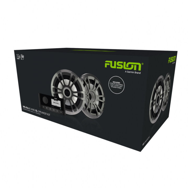 Komplett marinstereopaket med: Fusion RA60 Marinstereo med DAB+ & Bluetooth Fusion EL Sport RGB 6,5 Grå högtalare.