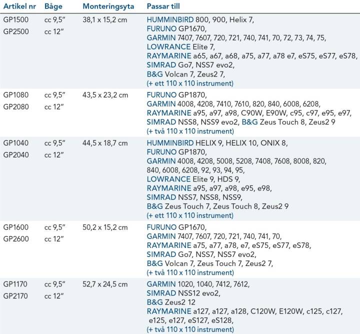 NavPod SystemPod för infällning av GPS, ekolod, radar och multifunktionsskärmar för montering på piedestalbågar med en cc monteringsbredd på 9,5” eller 12”. Samtliga levereras osågade.