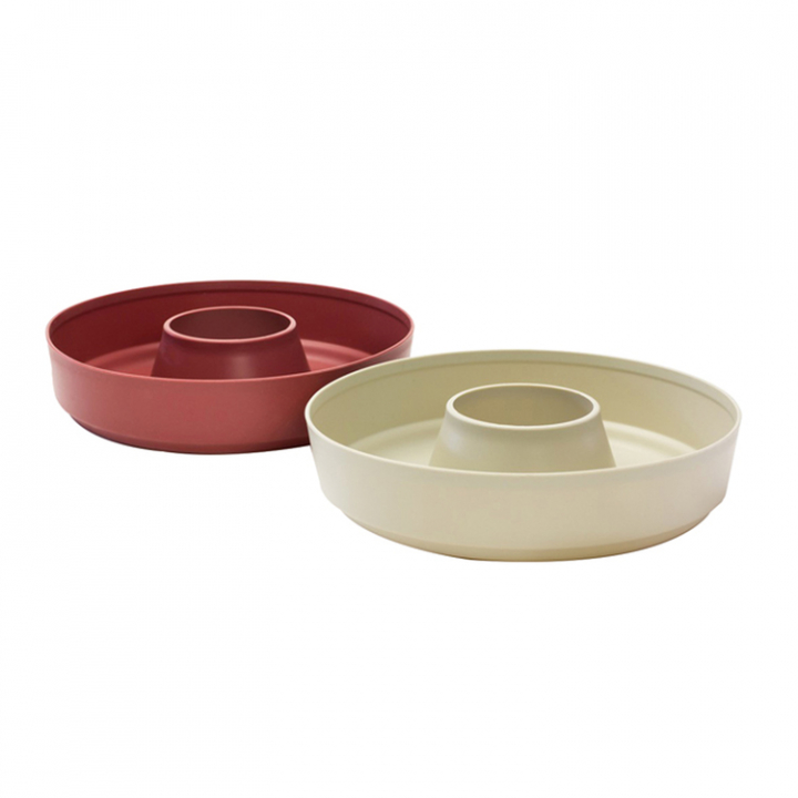 Två skräddarsydda silikonformar, beige och mörkröd. Olika kulör underlättar för den som vill använda en silikonform för ett speciellt ändamål, tex en för bakning och en för matlagning.