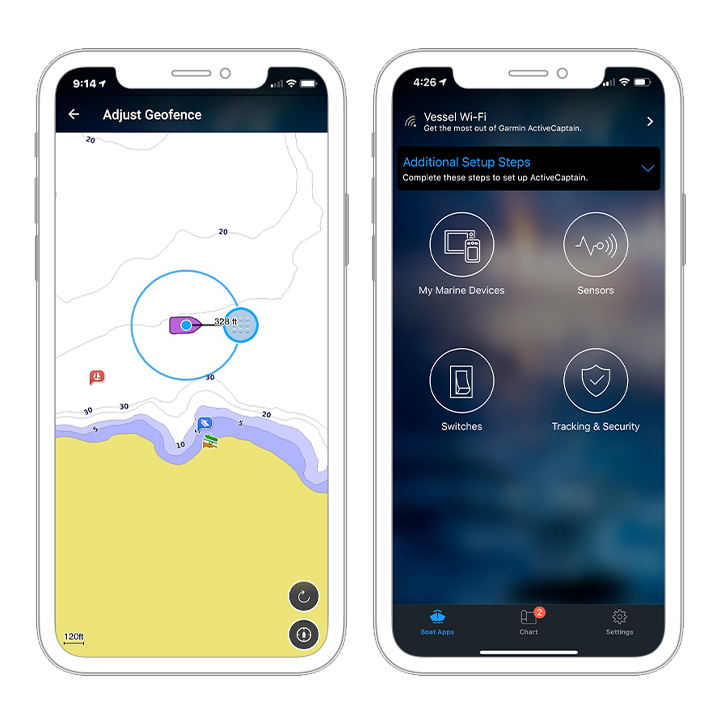 Hämta ActiveCaptain-appen till din kompatibla smartphone för att styra ditt fartyg. Här kan du ställa in larmaviseringar, ta kontroll över båten och mycket mer*.