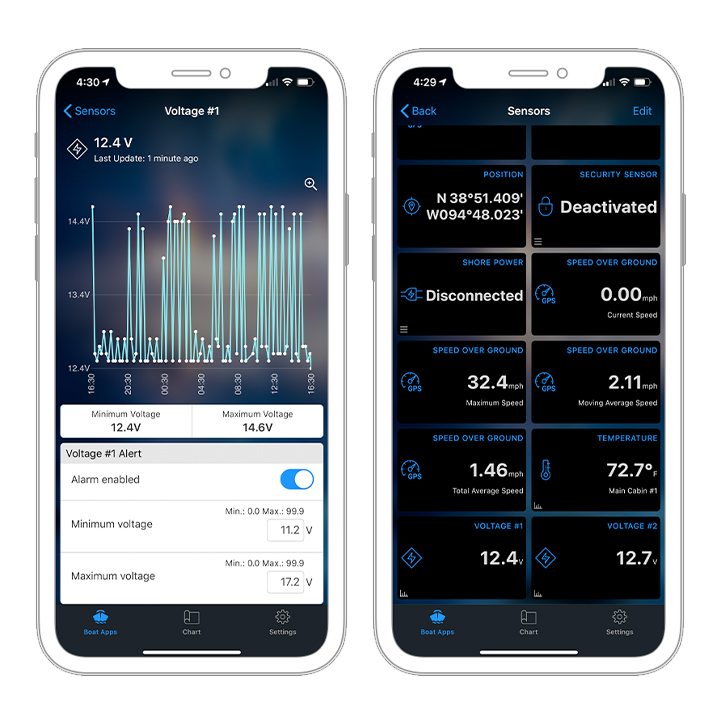 Få uppdateringar1 om båtens batteristatus, kölrumsaktivitet, Shore Power, temperaturändringar med mera. Ställ in larmaviseringar i appen ActiveCaptain.