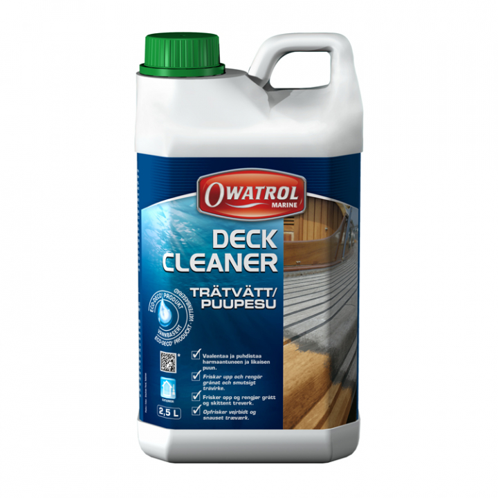 Owatrol Deck Cleaner avlägsnar all form av smuts, rost, förorening och mögel. Återställer grått och blekt trä till ursprungsfärg. Går att använda på dom flesta ädelträsorter som t.ex. teak, mahogny, ek, lärk med flera. Deck Cleaner är biologiskt nedbrytbar och innehåller ingen lösningsmedel eller blekmedel.