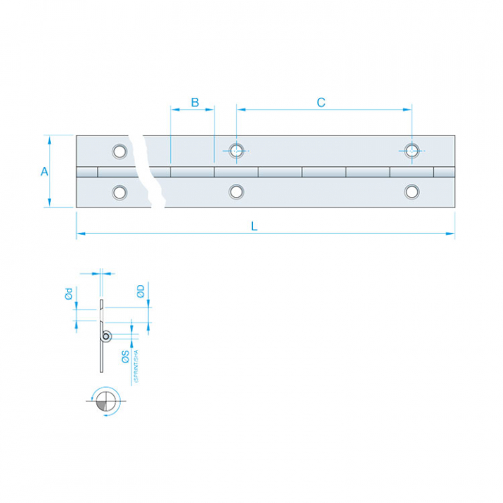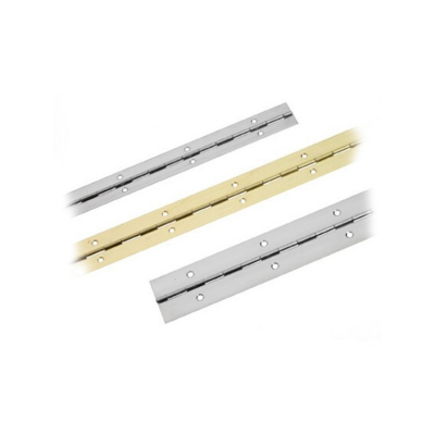Pianogångjärn i polerad mässing i tre dimensioner.