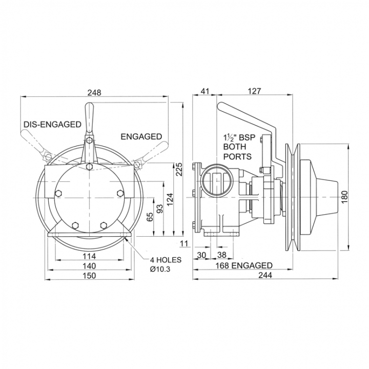 Jabsco självsugande impellerpump i brons med manuell koppling av remskiva. Pumpen aktiveras genom att spaken på pumpen flyttas.