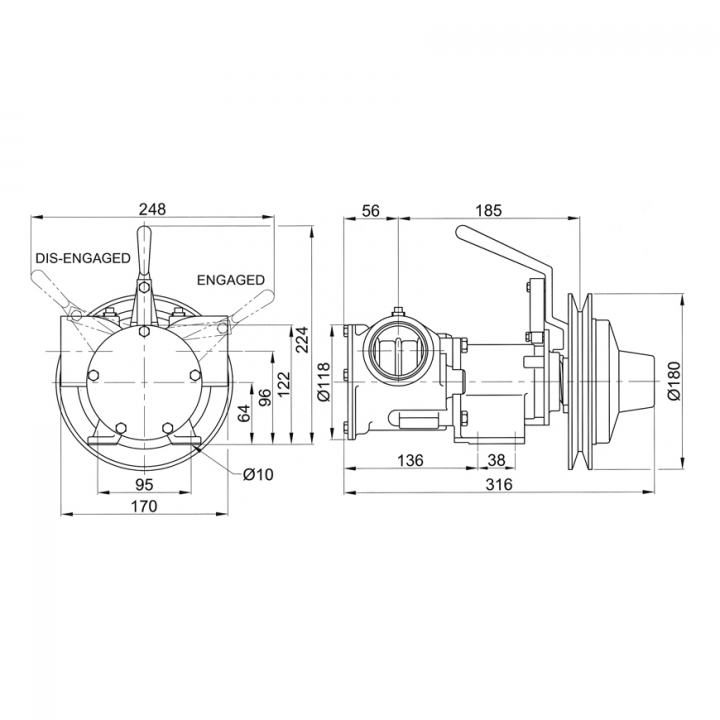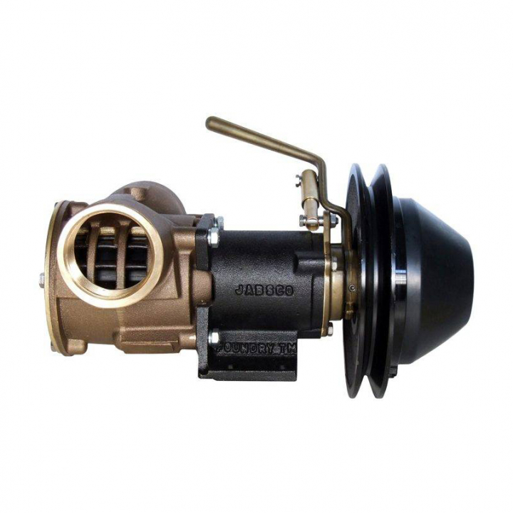 Jabsco självsugande impellerpump i brons med manuell koppling av remskiva. Pumpen aktiveras genom att spaken på pumpen flyttas.