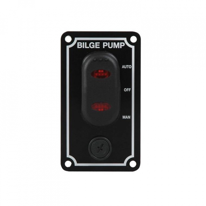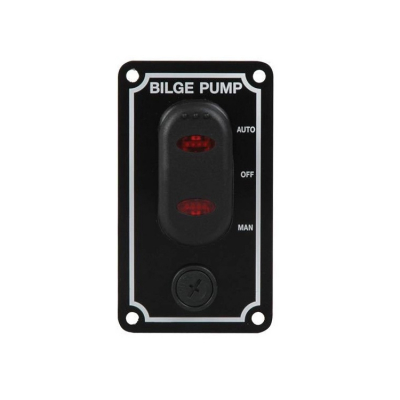 Svartlackerad horisontell pumppanel i aluminium med 3-vägsbrytare med diod, manuel-off-auto och säkring.