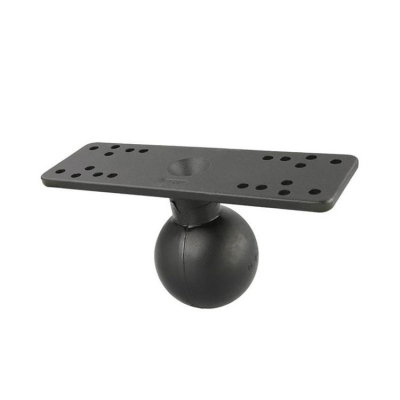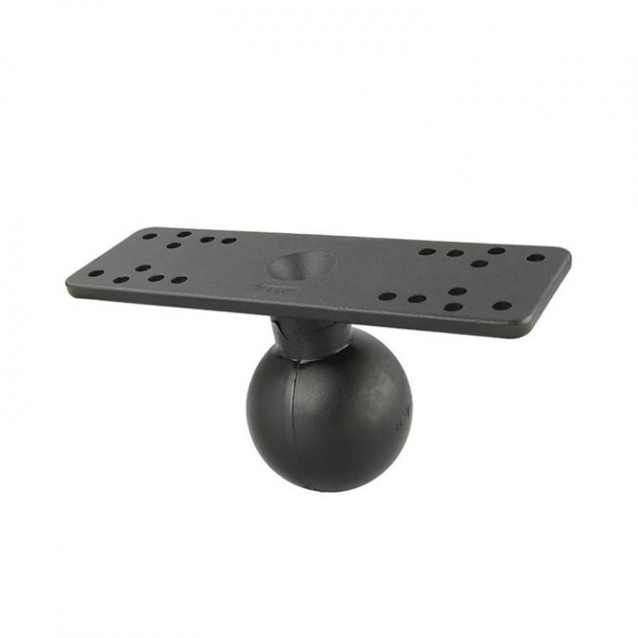 RAM-D-115BU, universal monteringsplatta, består av en kula med en diameter på 2,25", vinkelrätt ansluten till en plan 6,25" x 2" rektangulär platta. Plattan innehåller olika kombinationer av förborrade hål som passar många elektroniska enheter.