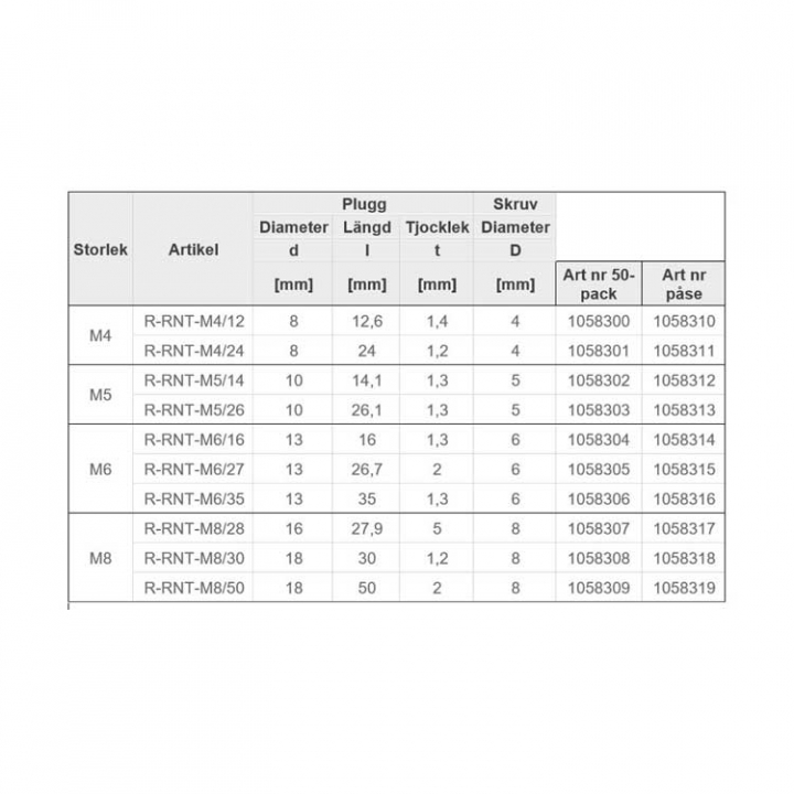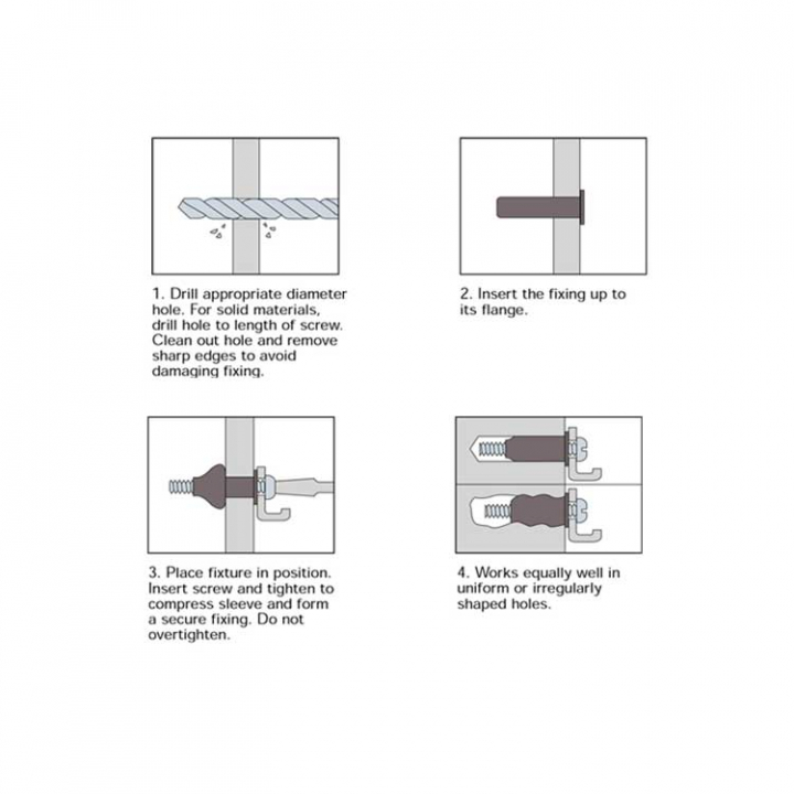 Vid åtdragning av skruven expanderar gummiexpandern på baksidan av infästningsytan. I porösa eller tjockare material expanderar den inne i materialet. Tillverkad av syntetiskt gummi med ingjuten metrisk mässingsmutter.