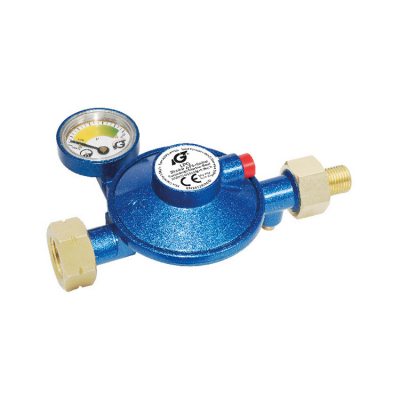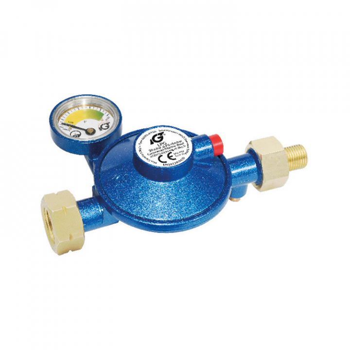 Maringodkänd gasregulator med manometer. CE-godkänd EN16129-D-M Används för blå gasolflaskor med avstängningsventil 1094598.