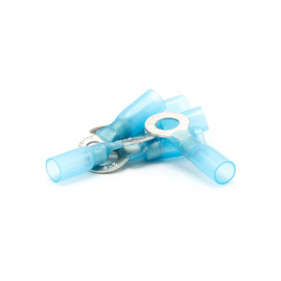 Blåa ringkabelskor med limmande krymphylsa för kablage på 1,5-2,5 mm2.