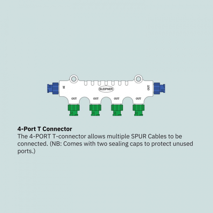 S-Link 4-Port T-Connector, t-kontakten med 4 portar gör det möjligt att ansluta flera Spur-kablar (OBS Levereras med två tätningslock för att skydda oanvända portar).