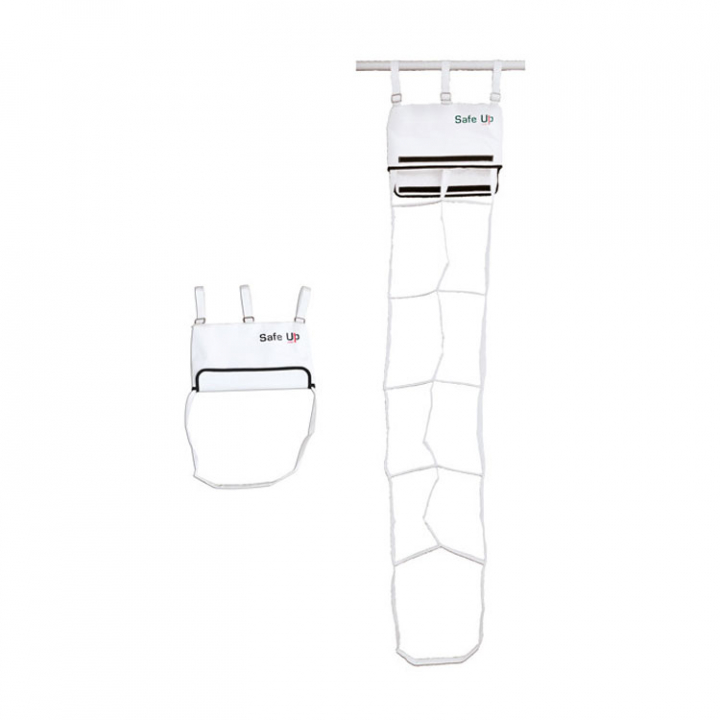 Hjälper nödställd att komma ombord igen vid en MOB situation. Kräver ingen extrern hjälp. Enkel att montera och enkel att fälla ut. Den nödställde drar i handtaget under väskan för att veckla ut stegen som utfälld består av 5 st fotsteg tillverkade av kraftigt nylonband.