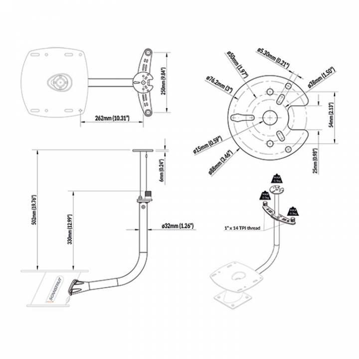 Den centrala stången fästs mot PowerTower genom en förborrad, 316 rostfri bakplatta. Färg överensstämmer med Scanstruts unika 4-lagers marina färgsystem. Intern kabelföring inuti PowerTower. Passar ett brett utbud av lanternor.