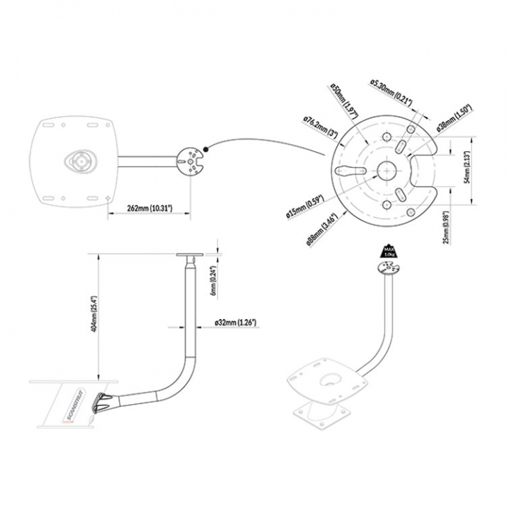 Den centrala stången fästs mot PowerTower genom en förborrad, 316 rostfri bakplatta. Färg överensstämmer med Scanstruts unika 4-lagers marina färgsystem. Intern kabelföring inuti PowerTower. Passar ett brett utbud av lanternor.