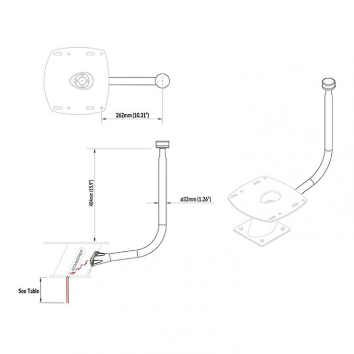 Den centrala stången fästs mot PowerTower genom en förborrad, 316 rostfri bakplatta. Färg överensstämmer med Scanstruts unika 4-lagers marina färgsystem. Intern kabelföring inuti PowerTower. Passar ett brett utbud av lanternor.