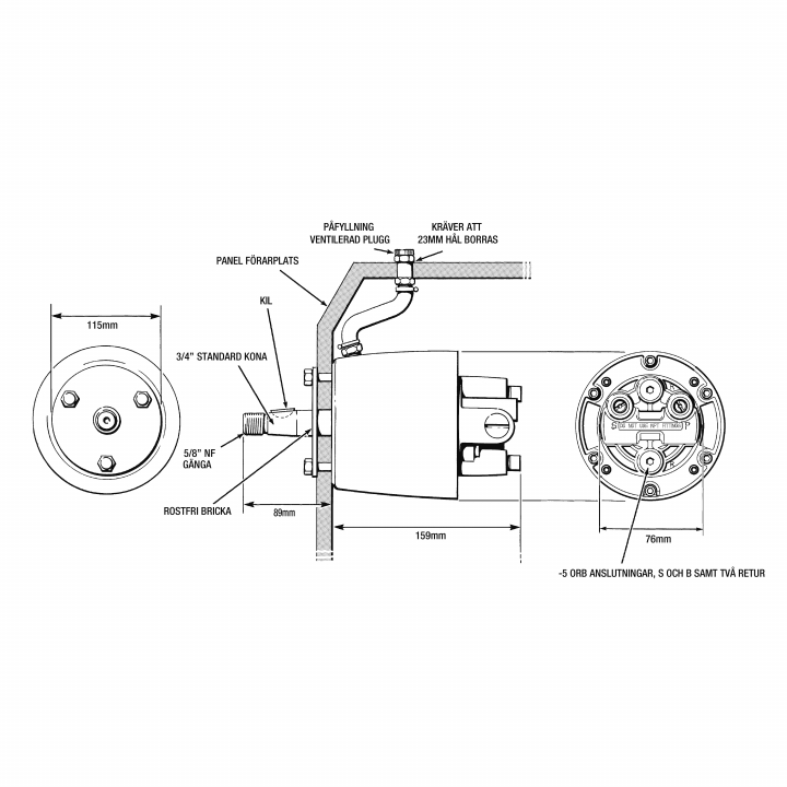 Levereras med 90° anslutningar -5 ORB med 9/16-24 gänga för slanganslutning.