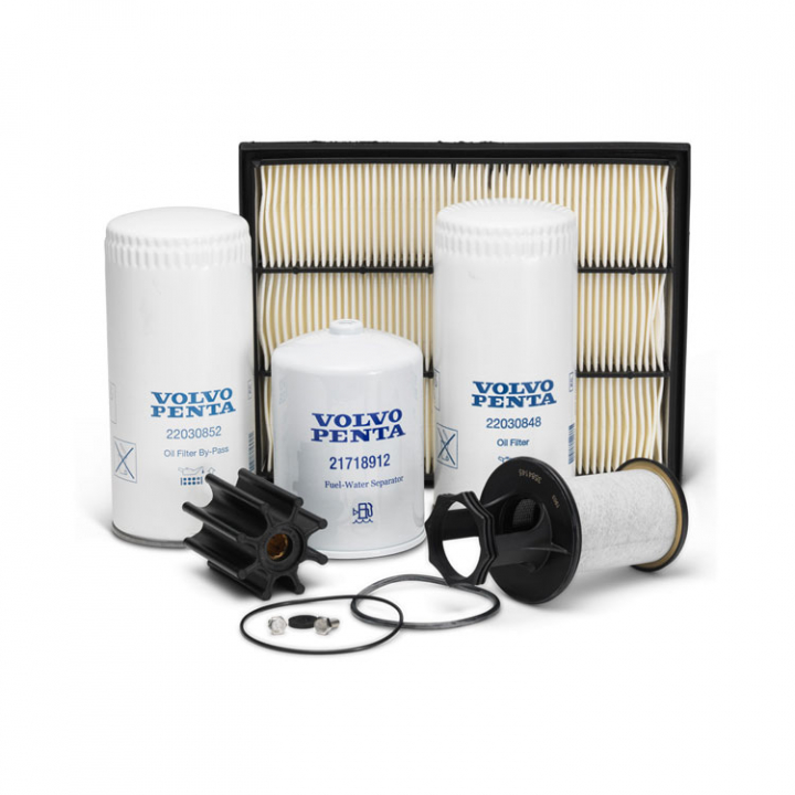 Servicesats för din motor som innehåller passande oljefilter, bränslefilter och impeller med packningar.