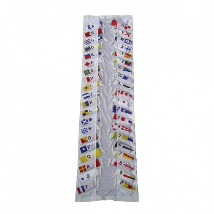 Signaler i rikligt markerat och överskådligt fodral (bokstavsflaggor, siffervimplar, svarsvimpel och likhetstecken). Levereras i snygg presentförpackning.