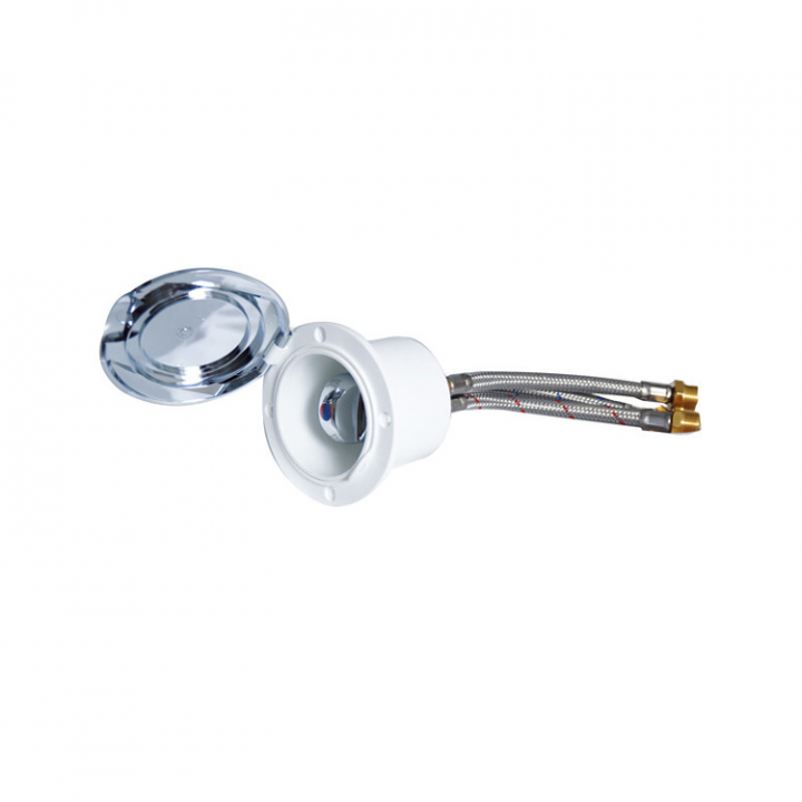 Blandarkran i stilfullt funktionell och enkel design, perfekt för inbyggnation. När det hörs ett klick är locket stängt. Vitt hus och kromat lock.