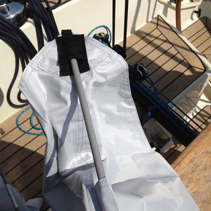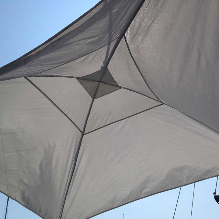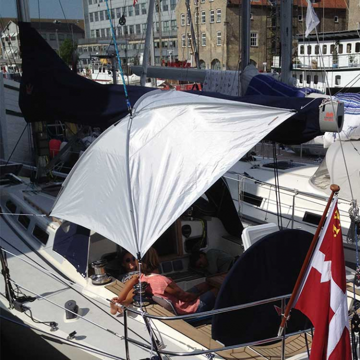 Praktiskt självbärande sol- eller regnskydd som enkelt hängs upp i fallet. Justerbara band i hörnorna. Monteras enkelt på någon minut, och tar hopfälld mycket liten plats. Väldigt praktiskt att ha liggandes i båten för de dagar man vill sitta under tak.