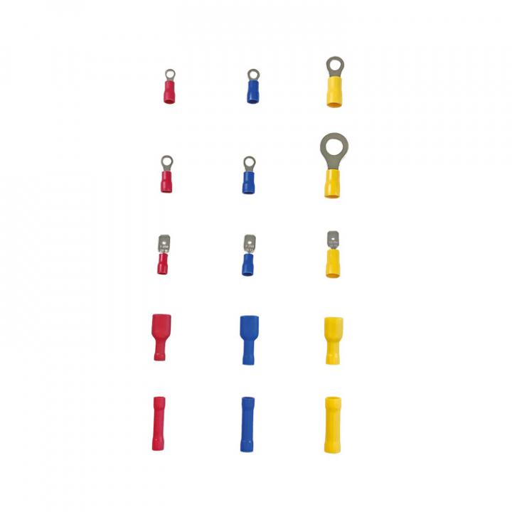 Sortimentlåda med kabelskor, flatstift och skarvkopplingar i fägerna blå, röd och gul.