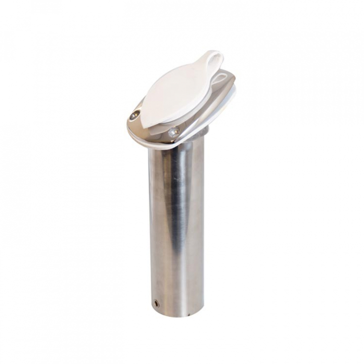 Fiskespöhållare för däck i polerat rostfritt stål med lock, monteringskragen är i gjutet rostfritt stål.