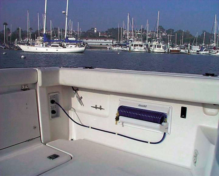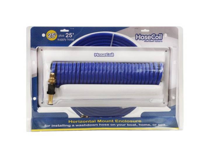 HoseCoil spolslangsystem är ett smart sätt att förvara spolslangen. Bra kvalitet på spolslang och anslutningar gör detta till ett mycket användbart hjälpmedel ombord på båten. De kraftiga spolmunstyckena finns även som tillbehör.