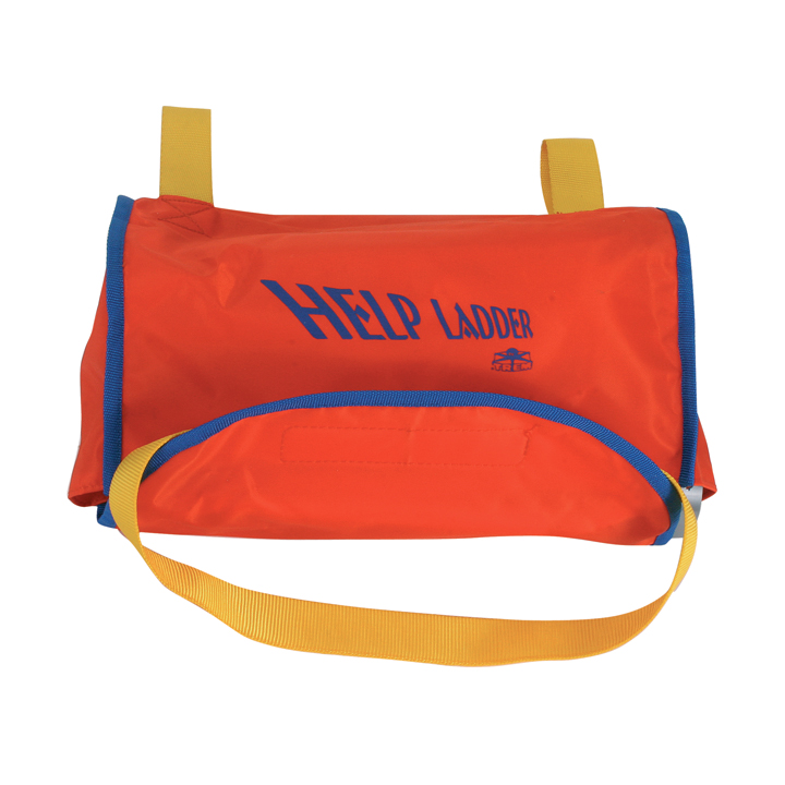 Stege av kraftig plast. Lätt och snabb att ta i bruk vid nödfall OBS! Man kan även öppna påsen från vattnet med hjälp av dess öppningslina.