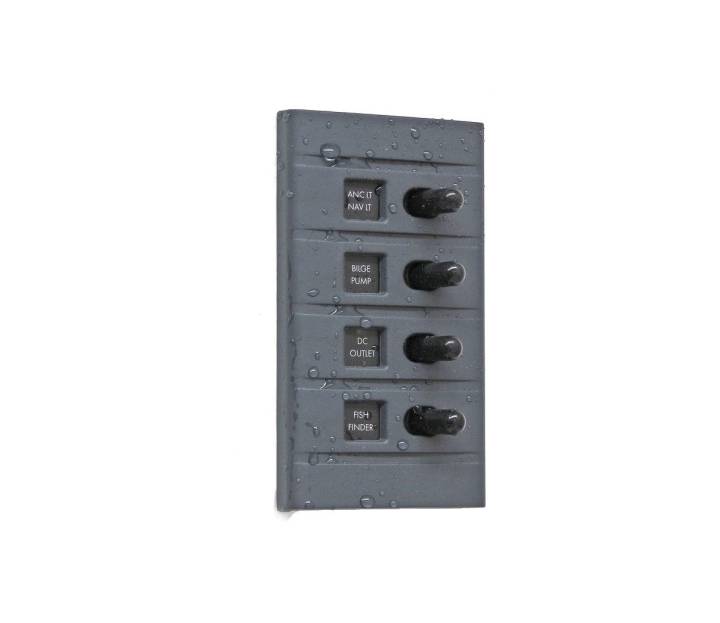 Konstant grön bakgrundsbelysning och röd LED-indikering vid påslag. Vid trasig säkring är dioderna släckta. Levereras med etiketter för märkning av brytare samt 5A och 10A flatstiftssäkringar.