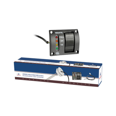 Strömbrytarpanelsats och nivågivare för septiktank. Den inkluderar panel med 4 LED-signalanordningar (1/4-1/2-3/4-FULL) plus 5-hålsflänsinsats för 15/55 cm höga tankar. Givarna måste kapas beroende på tankes höjd.