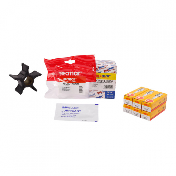 Suzuki servicesats till DF250A, DF250S, DF300 (2011+) OEM nr. 17400-98865-000 Innehåller oljefilter, bränslefilter, tändstift och impeller.