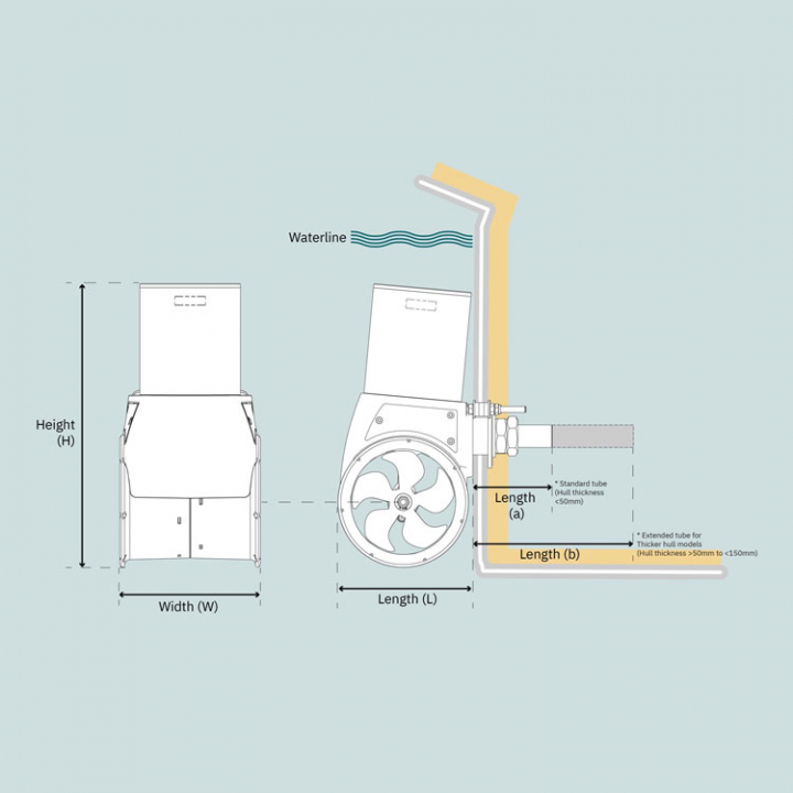 Den externa enheten är lätt att montera. Inget glasfiberarbete behövs på båtar med en skrovtjocklek upp till 150 mm.