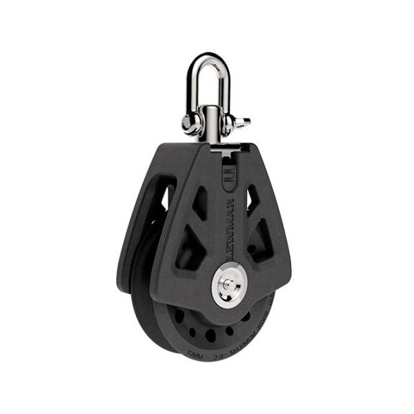 Rostfritt stålband för bästa styrka och längre livslängd. Styva, glasfiberförstärkta sidor hindrar linan från att kila fast. Banbrytande konstruktion med verktygsfri" låsmekanism på svirveln. Praktisk omställning från svirvlande till fast schackel.