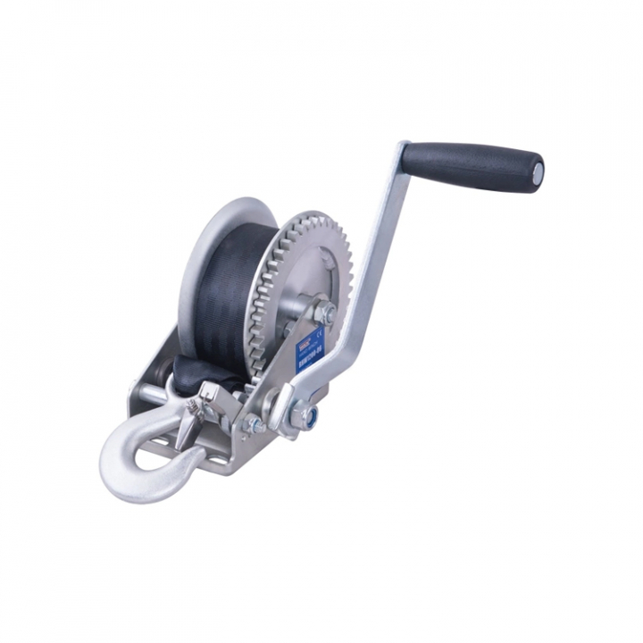 Trailervinsch med 8 m band utrustad med krok.