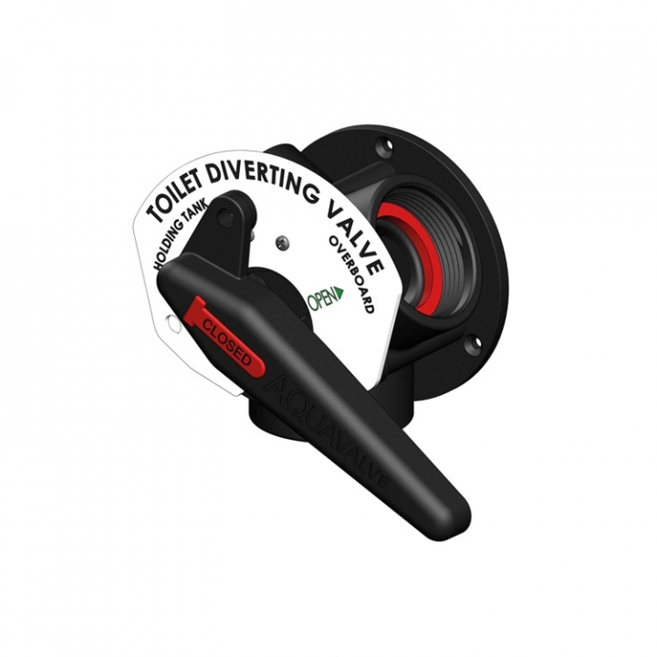 Kompletteras med Aquavalve slangsockel. Handtaget gör det möjligt att skifta mellan septiktank eller tömning överbord.