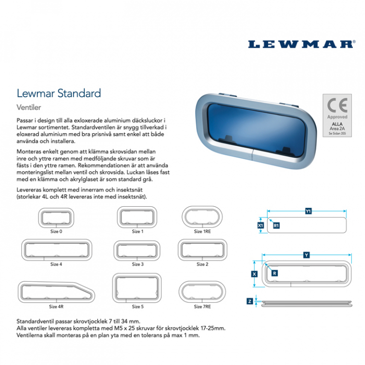Lewmar standard MK2 ventiler. Passar i design till alla exloxerade aluminium däcksluckor i Lewmar sortimentet. Standardventilen är snygg, tillverkad i eloxerad aluminium med bra prisnivå samt enkel att både använda och installera. Monteras enkelt genom att klämma skrovsidan mellan inre och yttre rammen med medföljande skruvar som är fästs i den yttre ramen. Rekommendationen är att använda tätningsmassa mellan ventil och skrovsida.