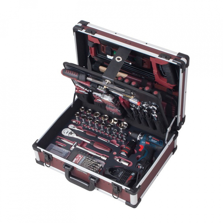 264 kvalitetsverktyg i eloxerad ABS-verktygslåda med hörnskydd. Den perfekta verktygslådan för båtfolket som bara vill ha bästa kvalitet. Inkl. Bosch batteriskruvdragare med laddare. En riktig allt i ett-väska som borde vara kutym i alla händiga båtägares verktygsskåp.