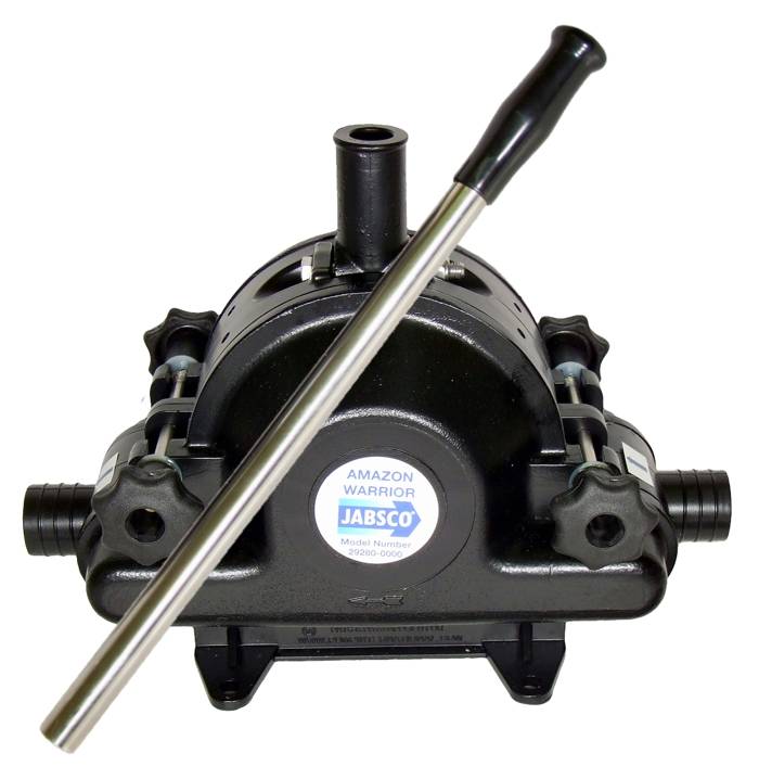 Jabsco Amazon Warrior kraftiga membran handlänspump för utanpåliggande med avtagbart handtag. Med tillbehörssatser 29279-0000 och 29289-0000 kan pumpen monteras infälld genom däck. Dubbelt pumphus för maximaleffekt, båda sidor fungerar oberoende av den andra vilket säkrar funktion.