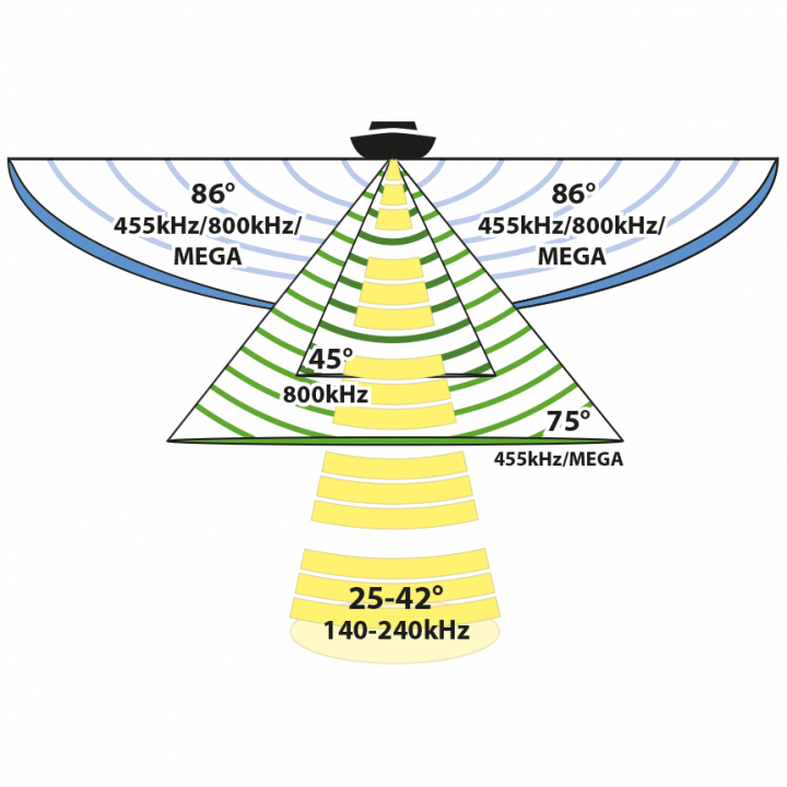 De unika bredbandselementen i Dual Spectrum-givarna har ett mycket lågt Q-värde och levererar detaljrika 2D-bilder med otrolig separation. Tack vare ett brett frekvensspektrum så visas fiskar som breda och tydliga bågar.