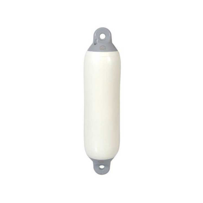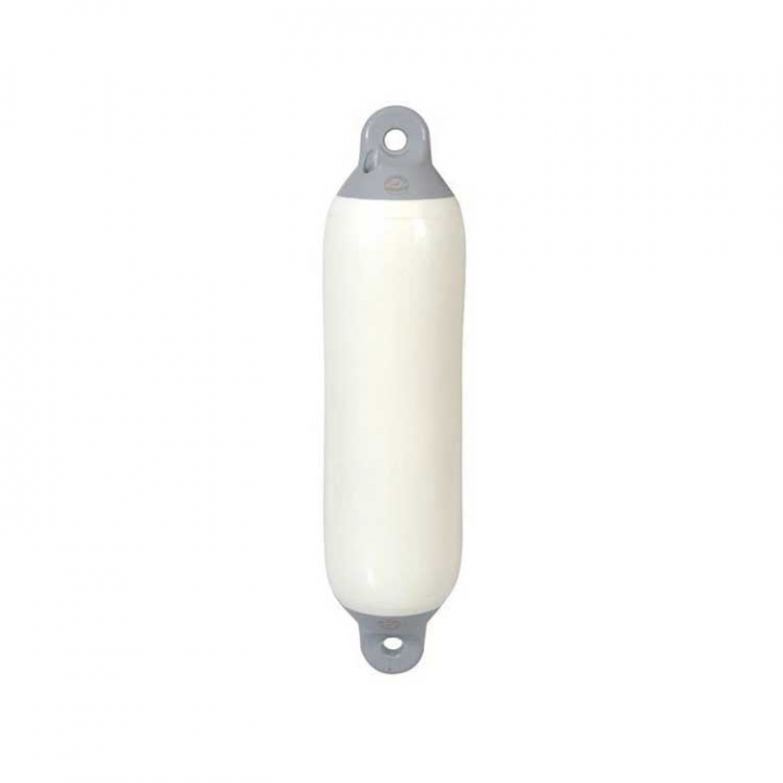 Vit Yacht fender med grå topp i en kraftfull design som tål havsmiljön.