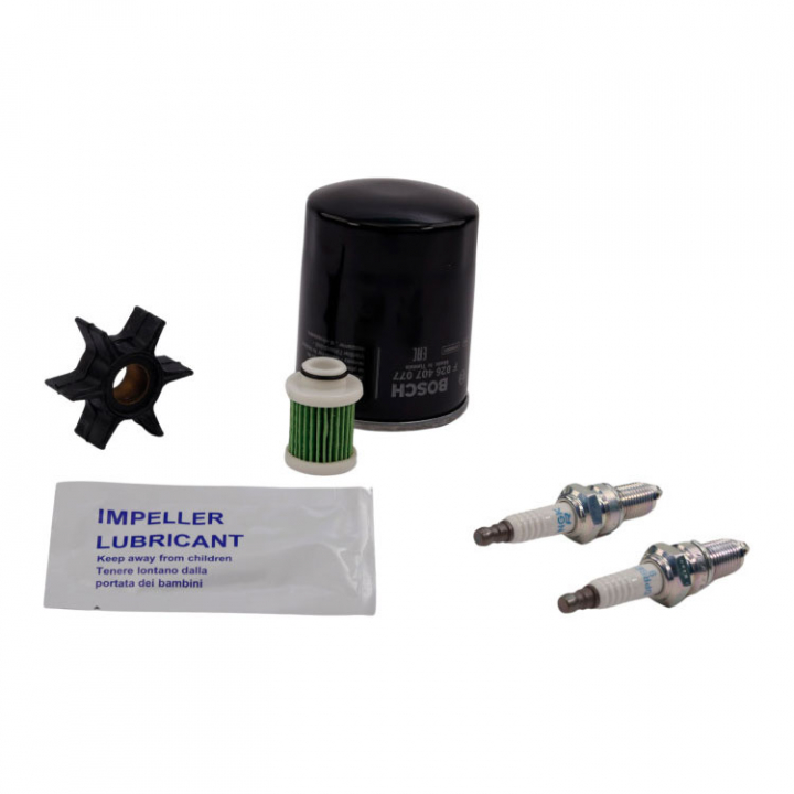 Yamaha servicesats till F25 G (2017+). Innehåller oljefilter, bränslefilter, tändstift och impeller.
