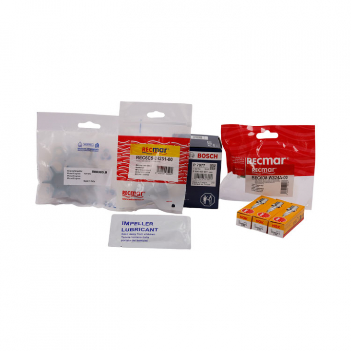 Yamaha servicesats till F30B (2009+) F40F (2009+) Innehåller oljefilter, bränslefilter, tändstift och impeller.
